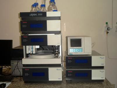 Cromatógrafo a líquido de ultra eficiência (CLUE) com detector DAAD, IR e fluorescência, marca dionex, modelo “U3000” (adquirido com recursos REUNI)